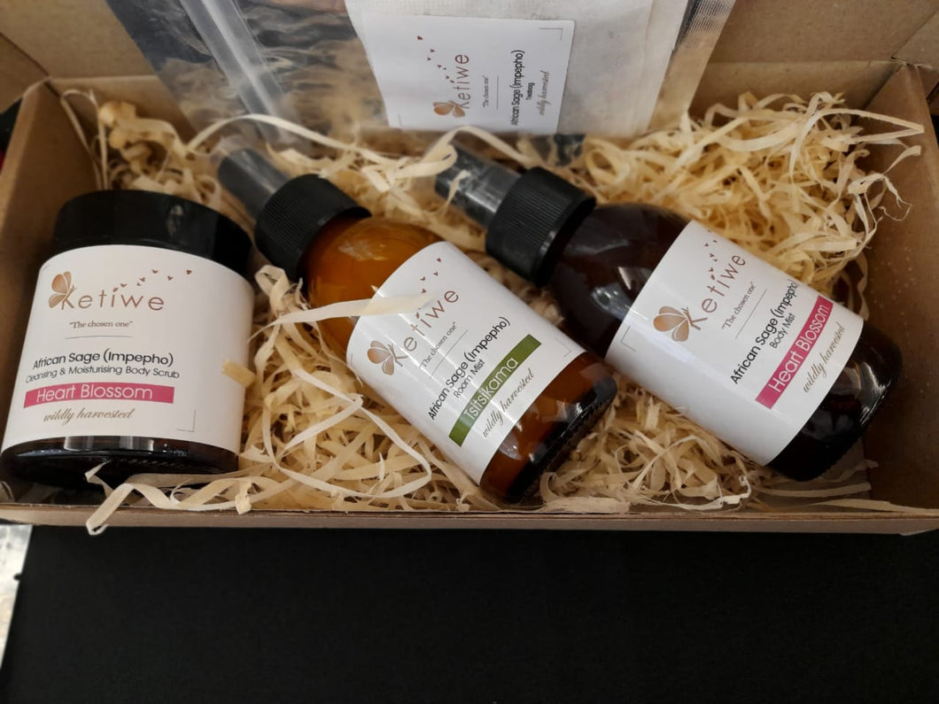 Consists of Heart blossom body mist, Heart Blossom hydrating body scrub, Tsitsikama room spray , 6//6*10 pack tea bag pouch wrapped in a gift box.